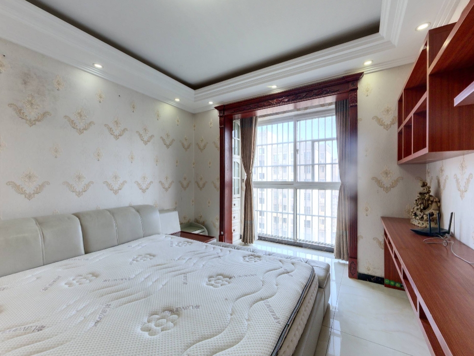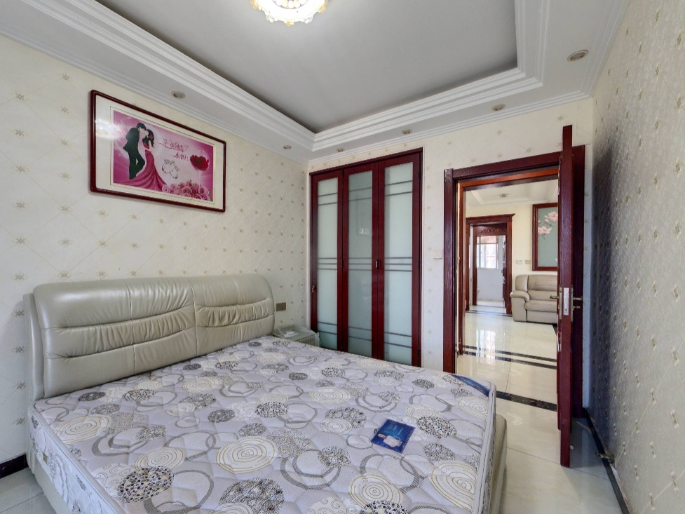 房子是偏新中式装修,实木门,全屋壁布,装修都用的品牌家具家电,小区出门就有公交站,西边是东城北路,小区南边是解放大道,很少出现堵车现象。